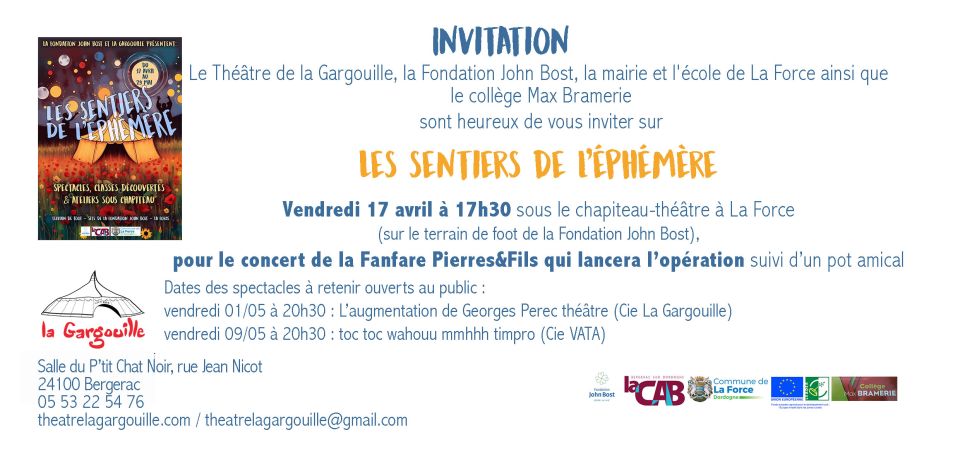 Actualités "Les sentiers de l'éphémère", théâtre de la Gargouille, inauguration vendredi 17 avril à 17h30, terrain de foot de la Fondation John Bost